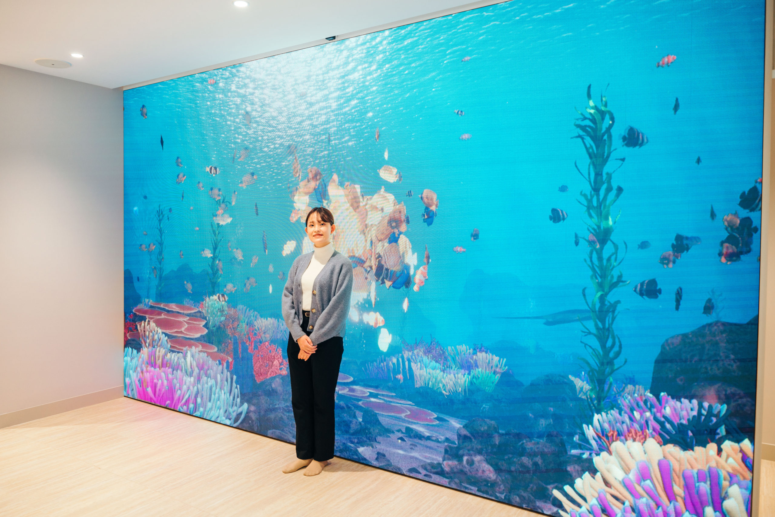 水とテクノロジーがテーマの壁一面に大きなディスプレーが配置されている次世代型保育園。