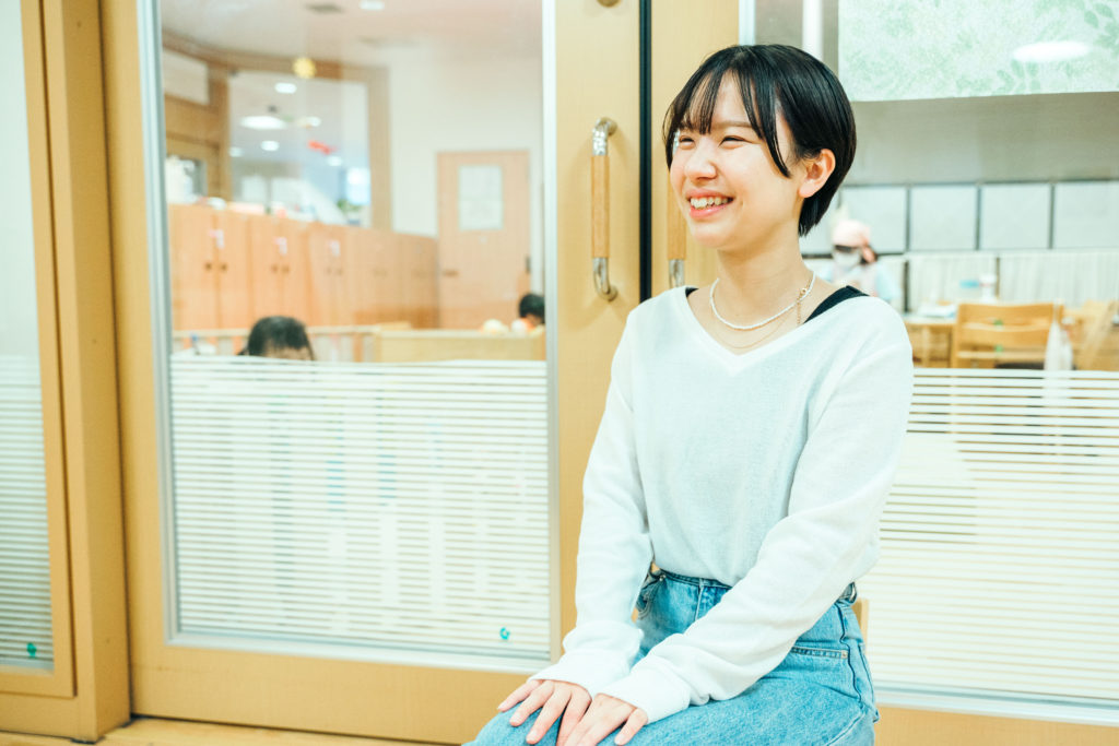 元々保育士っていう職業に憧れはあったんですけど、明確になりたいって思ったのは中学生の時に職業体験があって、私一人っ子なので、友達の兄弟とかで一緒に遊んだりとかはあったんですけど、そこで初めて密に子どもと関わって、明確に子どもの成長を支えたいとか子どもの笑顔を近くで見たいと思って保育士を志望するようになりました。