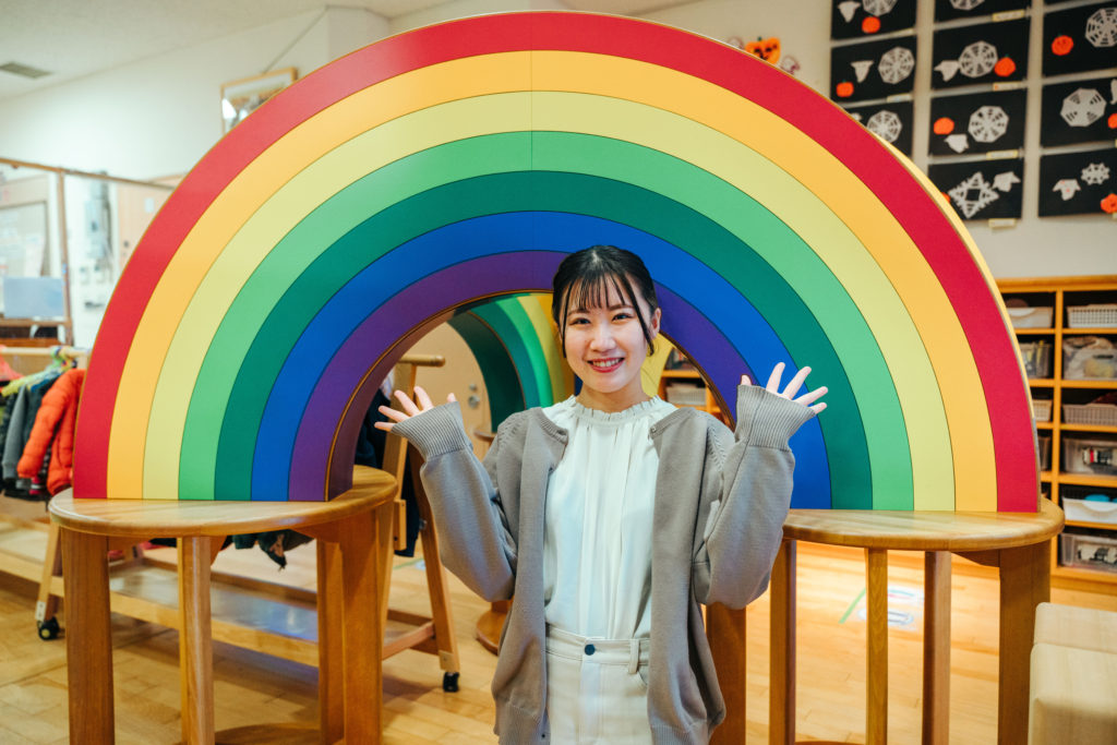 東北福祉大学 4年の小野 優花さんに、園の目の前からはスカイツリーが綺麗に見える、虹がテーマの亀戸こころ保育園でお話を伺いました。