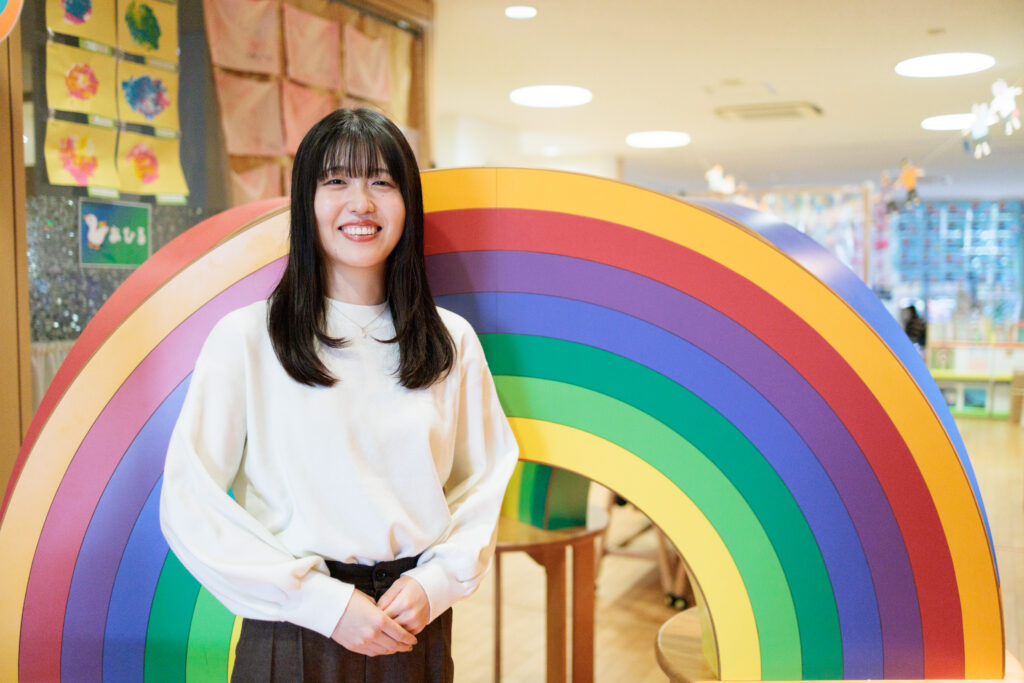 群馬県にある育英大学 4年の北澄 茉衣さんに、虹をテーマにした亀戸こころ保育園でお話を伺いました。保育士を目指した背景や来年に向けての抱負を語っていただきました。